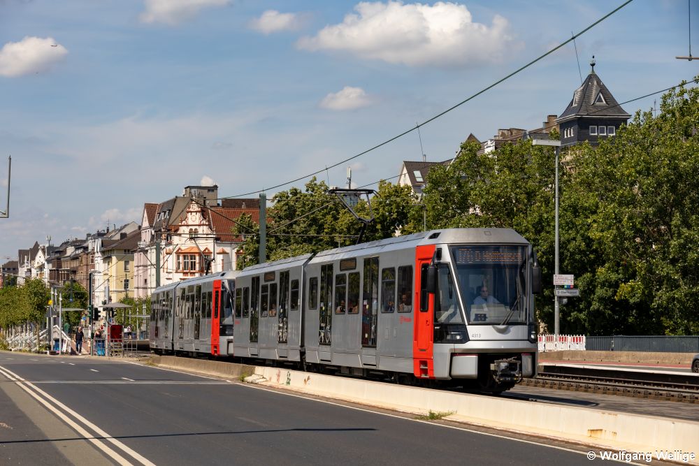 Stadtbahnwagen 4313 vom Typ HF6 hat am 18. Juli 2024 als Linie U76 nach Holthausen gerade die Haltestelle Luegplatz verlassen