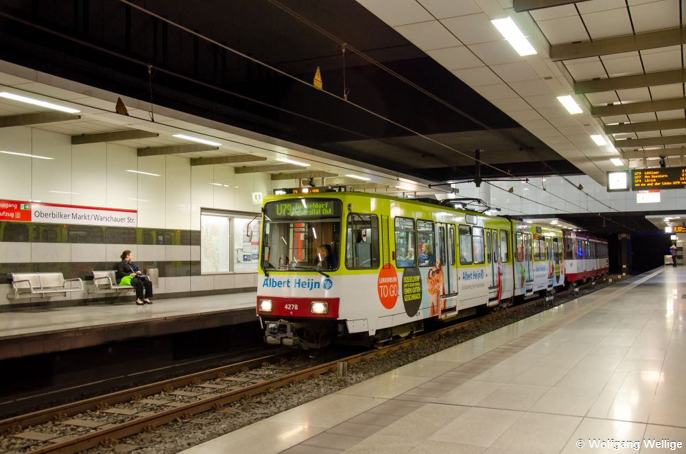 Wagen 4278 hält am 16. September 2013 als U79 Richtung Universität Ost in der unterirdischen Station Oberbilker Markt / Warschauer Straße. Er ist mit einer Ganzreklame für die niederländische Supermarktkette 'Albert Heijn' beklebt.