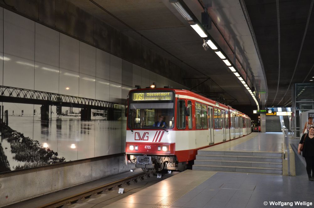 Der 'NF4' Nummer 2015 legt am 17. Juli 2024 einen Halt in der unterirdischen Station Duisburg Hauptbahnhof ein. Hinten ist der Hochbahnsteig für die Stadtbahnlinie U79 zu sehen, die auf demselben Gleis verkehrt.