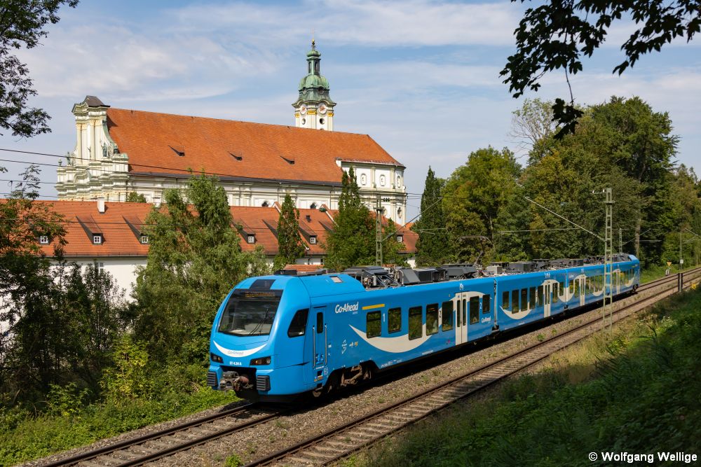 Die Beklebung des ET 434 ist noch nicht auf den neuen Namen 'Arverio' umgestellt, als er am 1. September 2024 am Kloster Fürstenfeld in Fürstenfeldbruck entlangfährt (RE 72 München - Memmingen)