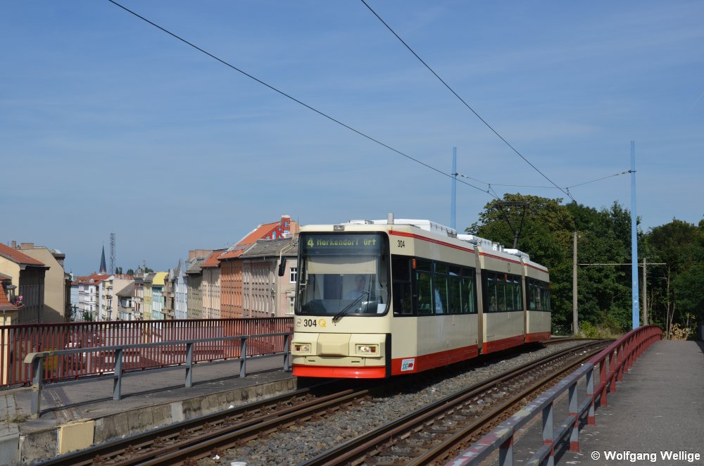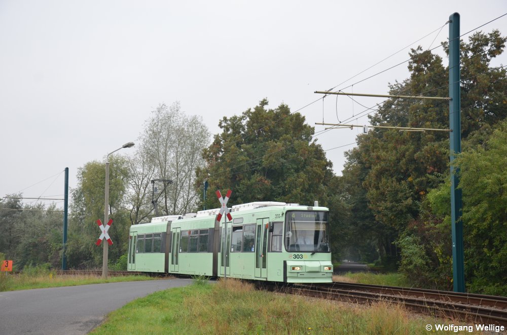 Wagen 303 trägt die aktuelle Hausfarbe der Stadtverkehrsgesellschaft. Das Bild entstand am 20. September 2014 auf der Überlandlinie nach Markendorf zwischen kurz vor der Haltestelle Gartenstadt.