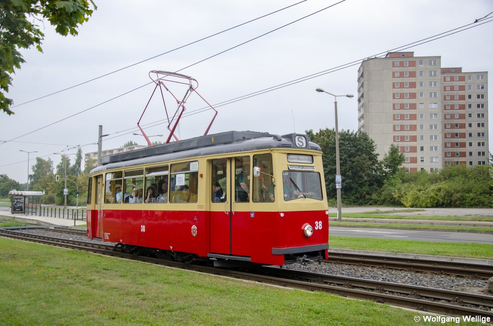 Museumsfahrzeug 38, ein so genannter LOWA-Wagen von 1955, hat vor einem der Plattenbauten im Stadtteil Neuberesinchen auf einer Sonderfahrt anlässlich des 'Tages für die Fahrgäste' am 20.09.2014 gerade die Haltestelle Birkenallee verlassen. Da kein original Frankfurter LOWA-Wagen erhalten blieb, wurde ein Fahrzeug der ehemaligen Straßenbahn Stralsund als Kopie hergerichtet.