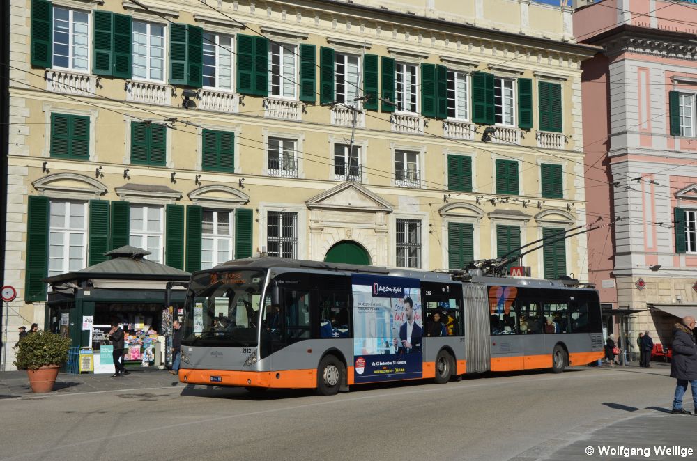 Die Linie 20 ist Genuas eizige Obuslinie. Am 18. Februar 2017 hat der vom Hersteller Van Hool gebaute Wagen 2112 gerade die Haltestelle De Ferrari verlassen.