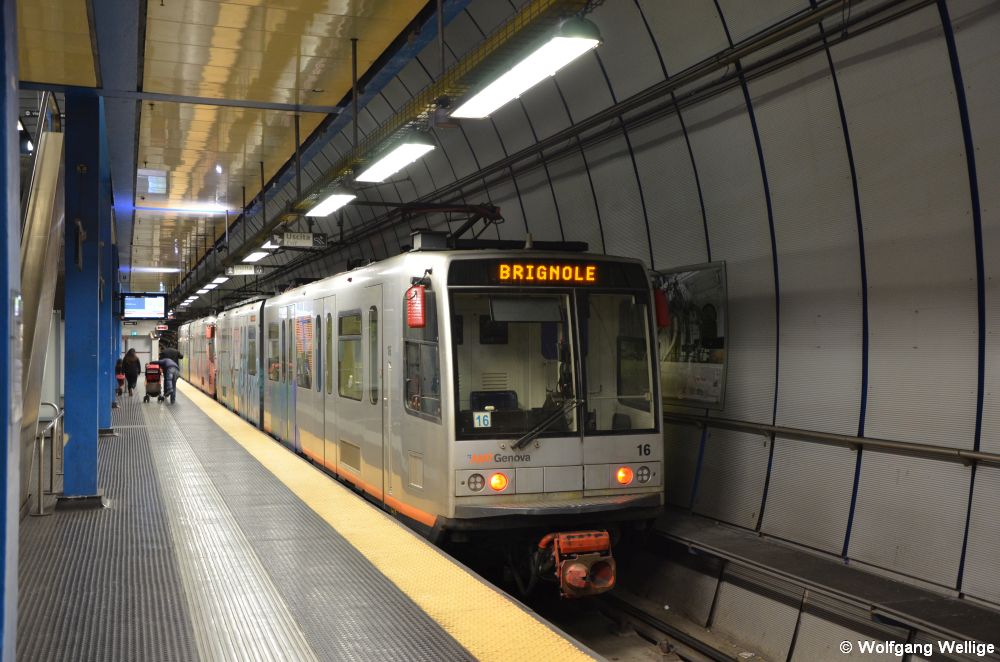 Der im Jahr 1992 in Betrieb genommene Wagen 16 der zweiten Generation hält in der Station Principe, die nach dem wichtigsten Bahnhof von Genua benannt ist. (18.02.2017)