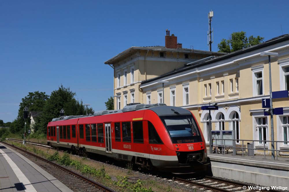648 350 erreicht am 16. Juni 2020 als RE 83 auf der Fahrt von Lübeck nach Lüneburg soeben den Bahnhof Ratzeburg mit seinem recht stattlichen Bahnhofsgebäude