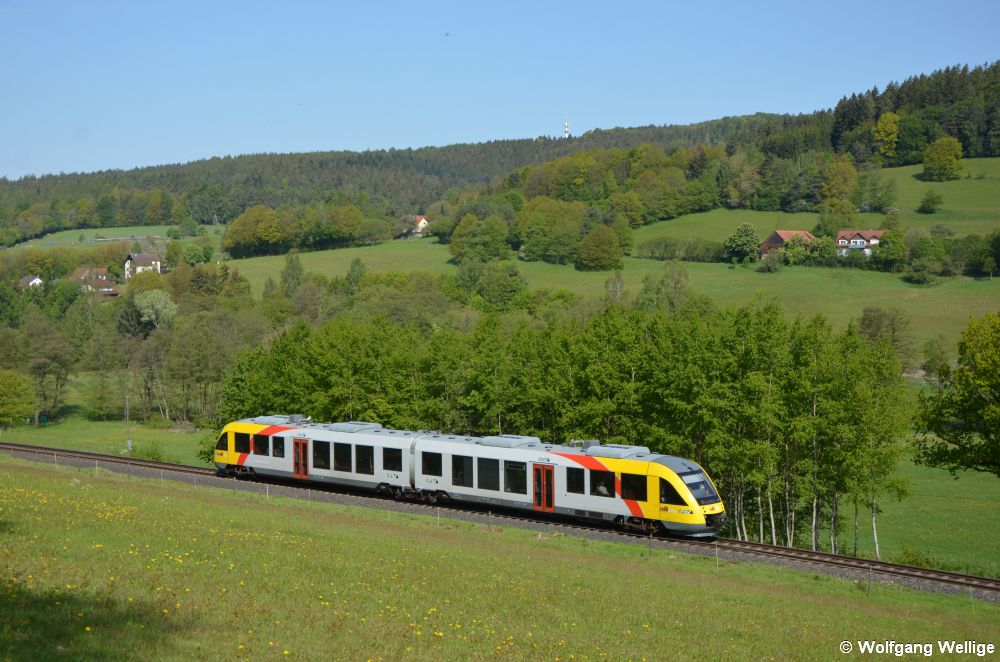 Der 'LINT'-Triebwagen VT 271 der Hessischen Landesbahn ist am 18. Mai 2019 auf der landschaftlich reizvollen Rhönbahn von Fulda nach Gersfeld im Einsatz, aufgenommen bei Altenfeld (Rhön).