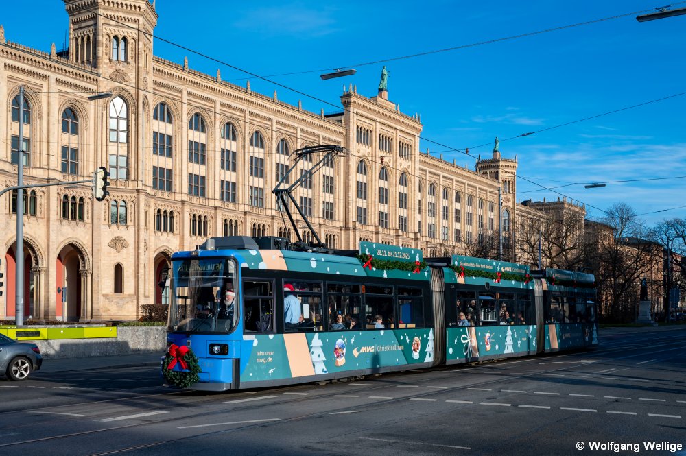 Jedes Jahr im Advent ist in der Münchner Innenstadt die 'Christkindl-Tram' mit Glühwein und Lebkuchen an Bord unterwegs. Am 20.12.2025 fährt der entsprechend beklebte und dekorierte Wagen 2164 vor der Haltestelle Kammerspiele die Maximilianstraße entlang.