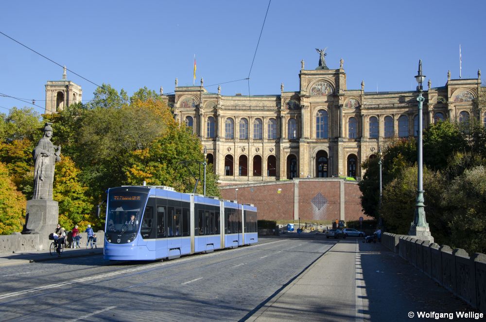 'Avenio' Nummer 2501 fährt am 17. Oktober 2019 vor der Kulisse des Maximilianeums über die Maximiliansbrücke