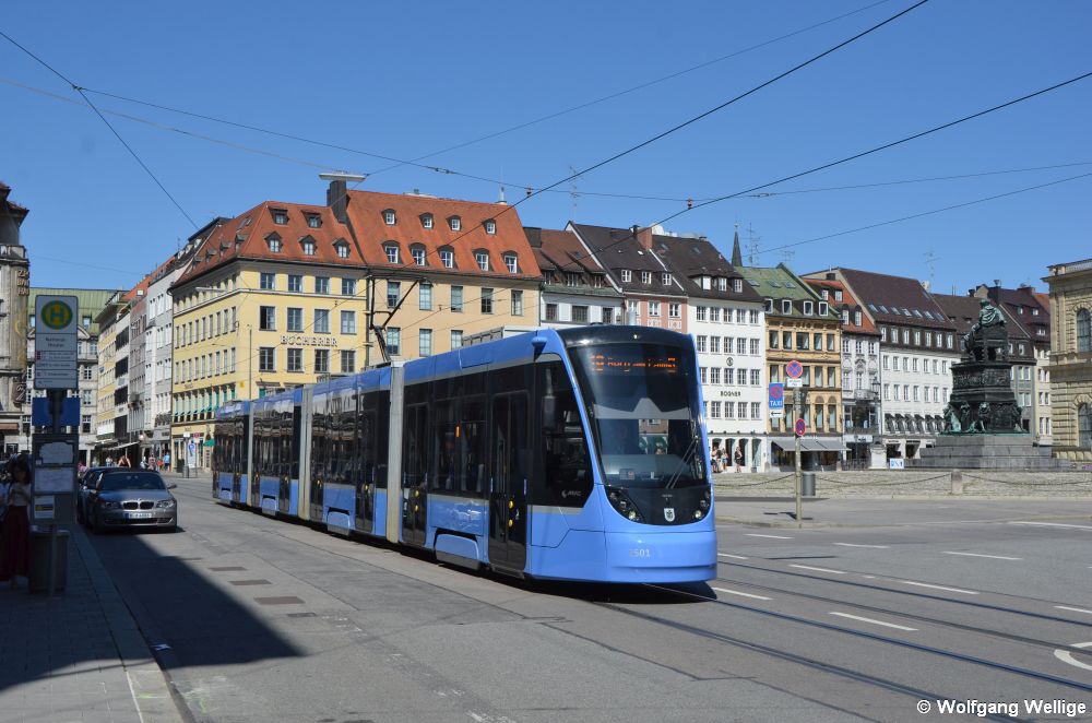 Der dreiteilige 'Avenio TZ' Nummer 2751 rollt am 10. Juli 2020 kurz hinter der Haltestelle Nationaltheater vor dem Opernhaus der Bayerischen Staatsoper entlang