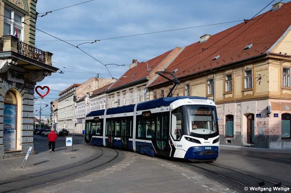 Im Frühjahr 2025 begann in Osijek mit den von Končar gebauten Fahrzeugen des Typs TMK 2500 das Niederflurzeitalter. Am 21.10.2025 fährt Wagen 2502 kurz vor der Haltestelle Trg Ante Starčevića durch die Fußgängerzone.