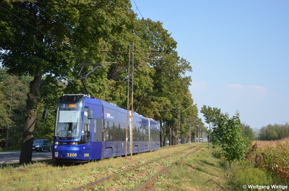Wagen 3208 ist am 12.09.2016 als Linie 3 auf der Außenstrecke nach Leśnica unterwegs, aufgenommen nahe der Haltestelle Grabowa.