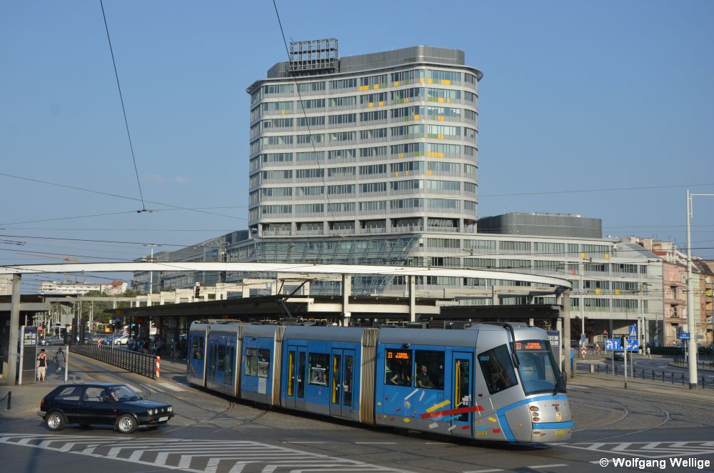 Zweirichtungs-Wagen 3103 vom Typ Škoda 19T am 12.09.2016 als Linie 33 an der großzügig angelegten Umsteigehaltestelle Plac Grunwaldzki